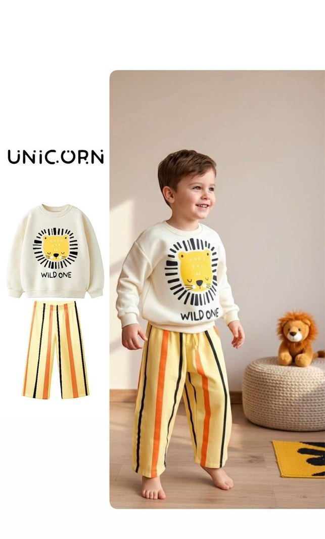 Uzun kollu, yuvarlak yaka, üzerinde aslan baskısı ve 'WILD ONE' yazısı bulunan örme üst ile sarı çizgili, yumuşak kumaştan yapılmış rahat pantolon takımı. LİON WİLD ONE TAKIM 3 iplik üst Canvas dokuma pantolon Bedenler 2 3 yaş 3 4 yaş 4 5 yaş 5 6 yaş 7 8 yaş