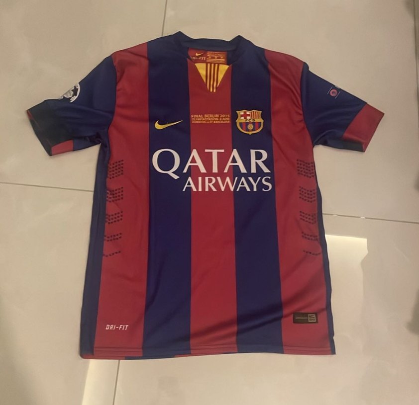 Bordo lacivert renklerde, baskılı, kısa kollu, dar kesim erkek tişörtü. Sentetik kumaştan, drapeli detaylı, 'QATAR AIRWAYS' ve 'DRI-FIT' yazılı. Spor ve sokak giyimine uygun. ⚽