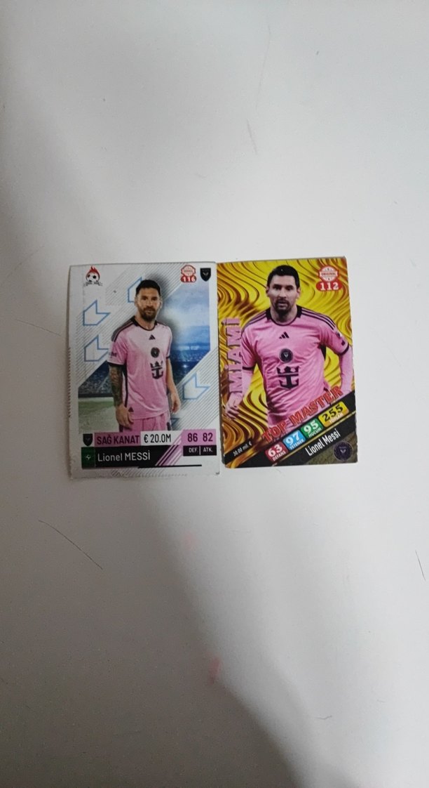 İki adet Lionel Messi spor kartı, pembe formayla oyuncu istatistikleri ve pozisyon bilgileriyle birlikte yer alıyor. ⚽