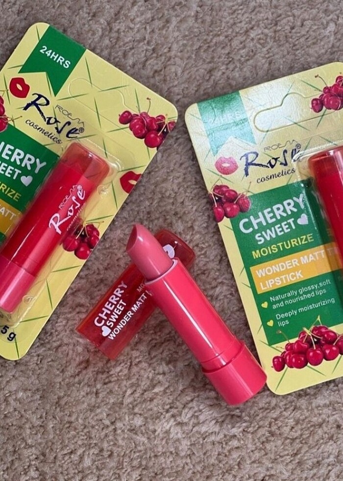 Kirazlı,çikolatalı ve çilekli olmak üzere üç çeşit dudak nemlendirici.Adet fiyatıdır