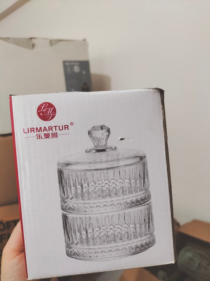 Beyaz ve gri renklerde, desenli camdan yapılmış çift katlı saklama kabı. Kapaklı ve LIRMARTUR markalıdır. ️