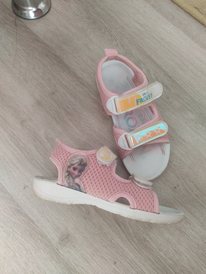 Nefes alabilir kauçuk malzemeden yapılmış, pembe renkli ve Frozen desenli kız çocuk sandaletleri. Ayarlanabilir cırt cırtlı bantlarla rahat kullanım sağlar. lisanslı 29 numara sandalet