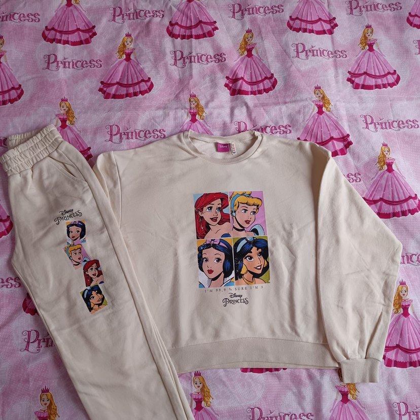 Beyaz renkte, uzun kollu ve yuvarlak yakalı kız sweatshirtü. Rahat kesim ve yumuşak, sıcak kumaştan. Önünde renkli Disney prenses baskıları var. İkili takım