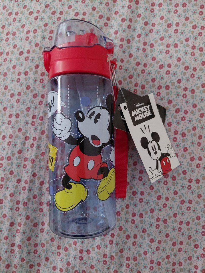 Canlı kırmızı renkte, Mickey Mouse desenli çocuk matara. Kapaklı ve bilek kayışlıdır, kolay taşınır. sıcağa ve darbeye dayanıklı su matarası yeni