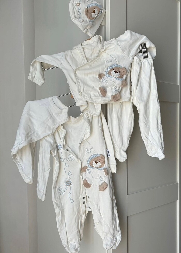 Çok çok kaliteli pamuktan 1 şapka, 1 kolsuz atlet, 1 pantolon, 1 zıbın, 1 tulumla birlikte toplam 5 parçalık tam set. Son iki fotoğrafta işaretlediğim 2 leke var, inceleyiniz. Uygun fiyat yazıyorum.