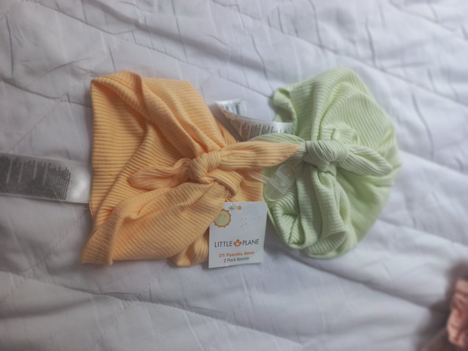 Bej ve açık yeşil renklerde, yumuşak sentetik kumaştan yapılmış, bağcıklı 2'li bebek bone seti.