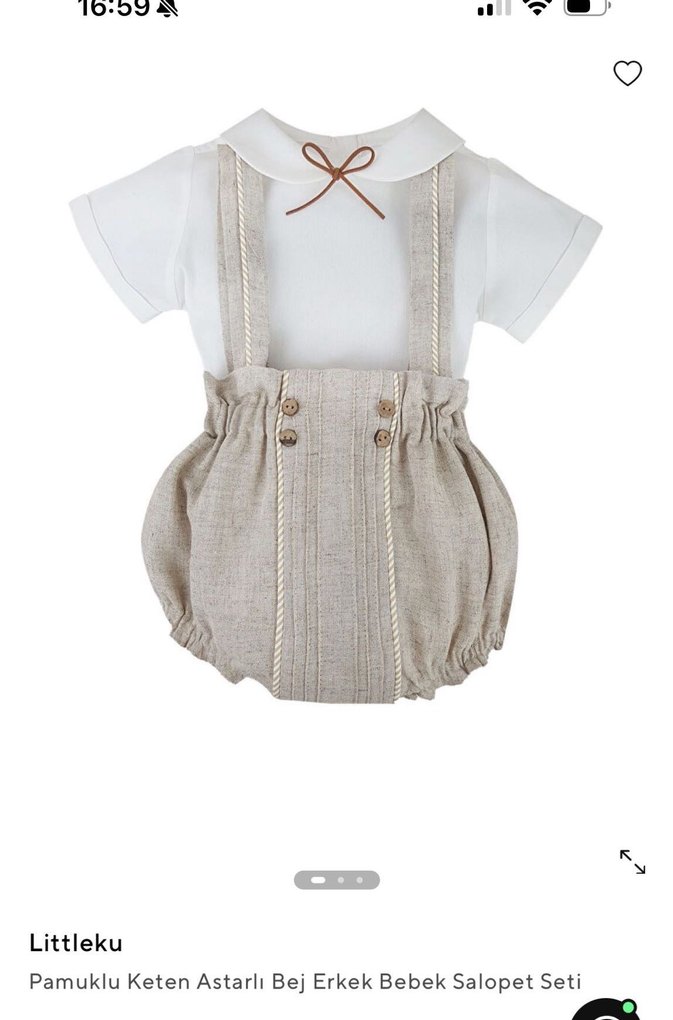 Bej keten kumaştan, kısa kollu, düğmeli ve askılı vintage tarzda erkek bebek tulumu. Littleku markasına ait. Beymenden alınmıştır bir saat giyildi sıfırı 4.750 liradır 6-9 ay arasıdır.