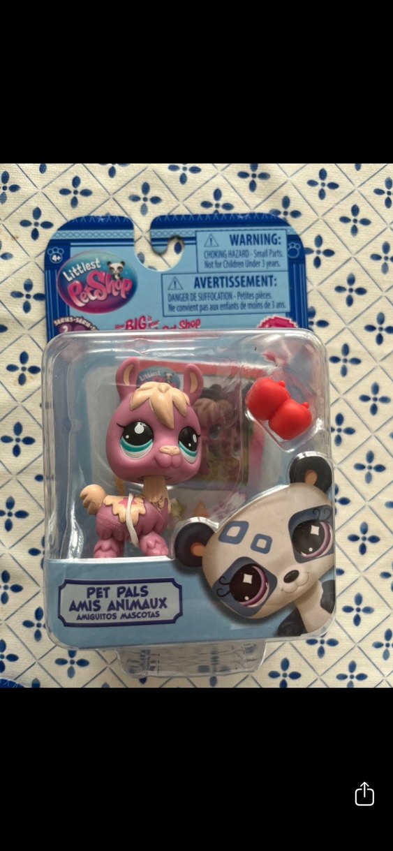 Littlest Pet Shop pembe renkli, büyük gözlü bir hayvan figürü ve kırmızı aksesuar içerir. Orijinal ambalajında, güvenlik uyarıları ile birlikte.