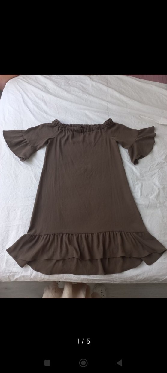 Kolları ve etek kısmı fırfırlı detaylara sahip, bol kesim ,kayık yaka şık elbise.Rengi tam kahverengi değil kahve ve taş rengi karışımı gibi, birkaç yerde minik ip çekmesi var onun dışında sorunu yok