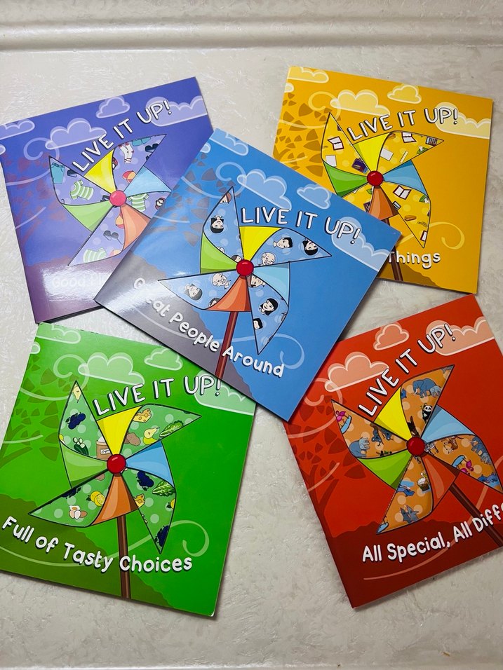 Canlı renklerde, 'Live It Up!' temalı farklı konularda çocuk kitapları seti.