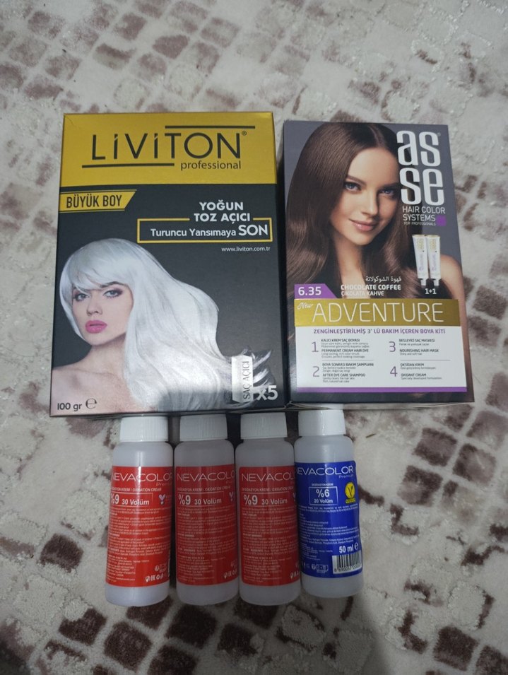Liviton profesyonel büyük boy yoğun toz açıcı ve Asese 6.35 saç boyası içeren set. Canlı renkler için açıcı ve geliştirici şişelerle birlikte gelir.
