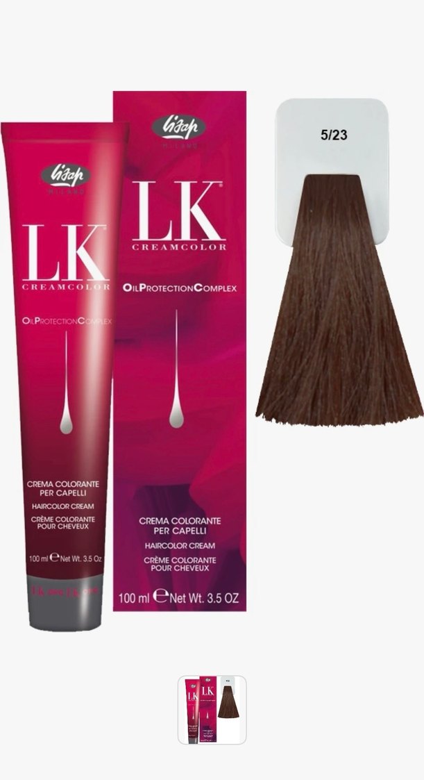LK saç boyası kremi 5/23 numaralı kahverengi tonunda, saçları koruyan yağ koruma kompleksi içerir. 100 ml tüpte sunulur.