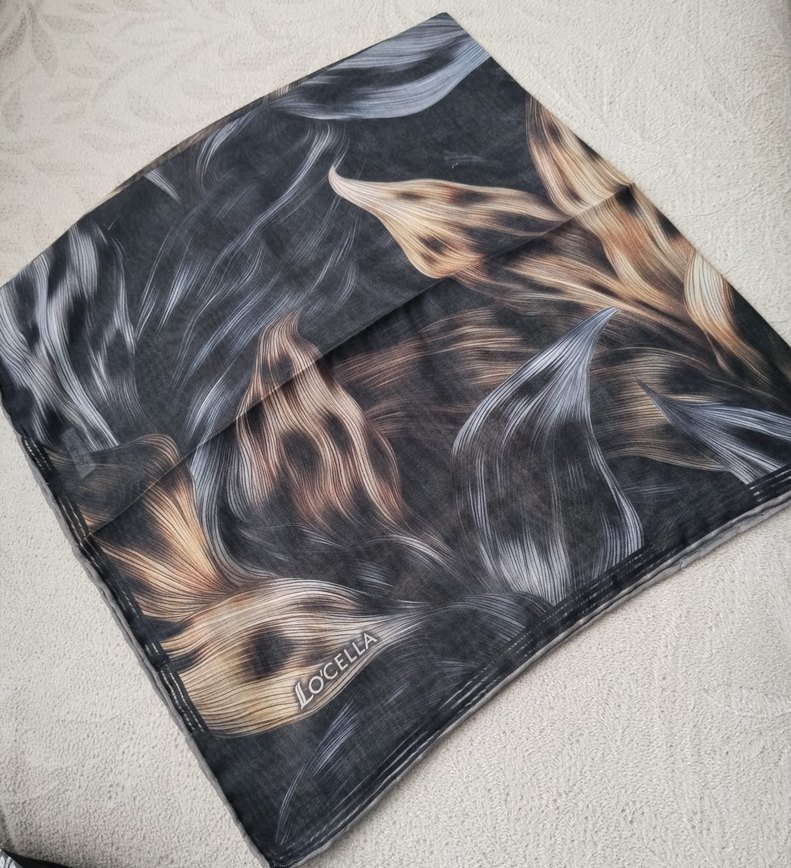 Yumuşak sentetik kumaştan, gri ve bej tonlarında, bohem desenli drapeli kadın fular. LOCELLA markası ile zarif detaylar sunar.