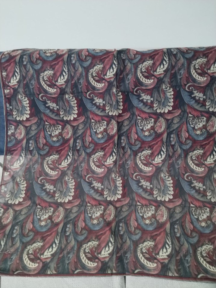 Bordo renkte, yumuşak sentetik kumaştan yapılmış, vintage desenli ve drapeli kadın şalı. Bohem ve hippie tarzını yansıtır.