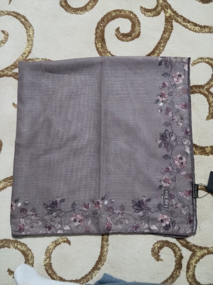 Yumuşak sentetik kumaştan, kenarlarında zarif dantel ve çiçek desenleri bulunan gri kadın şalı, mütevazı bir stil için uygun.