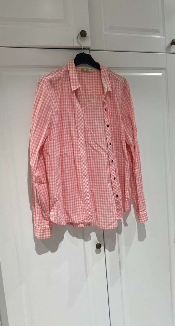 Pamuk kumaştan yapılmış, yakalı, düğmeli, uzun kollu, pembe kareli ve bol kesim kadın gömleği. Günlük kullanıma uygun, Paris tarzı rahat sokak modası. Hiç kullanılmadım.