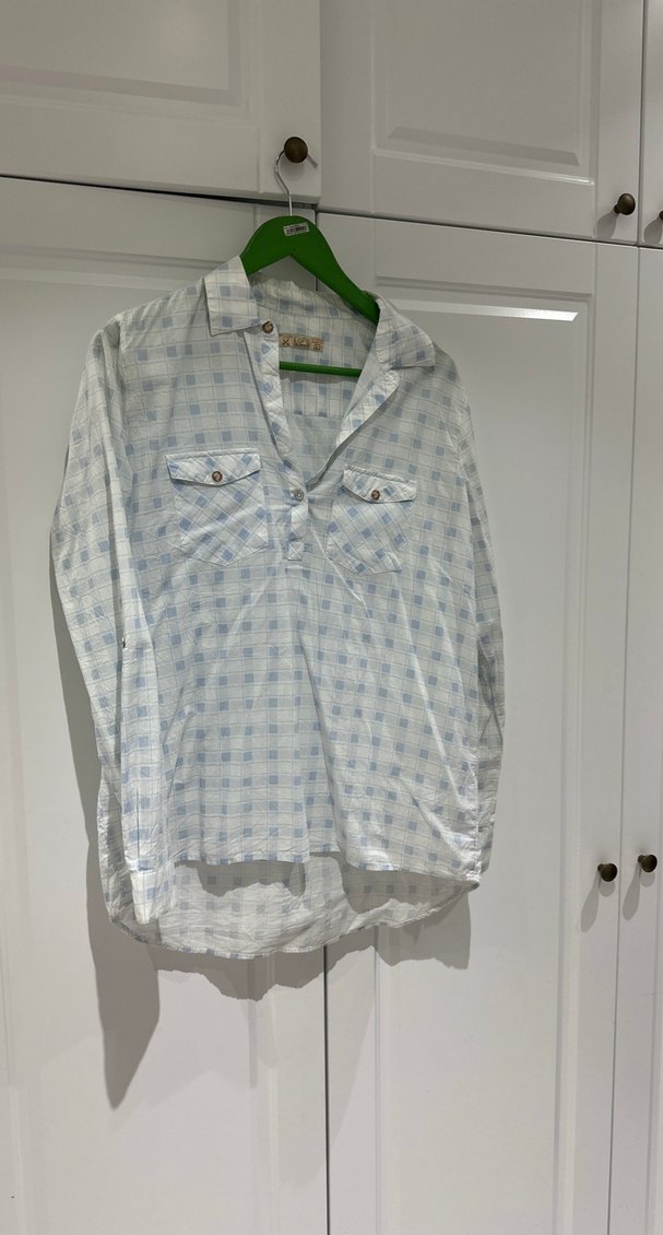 Pamuk dokulu, düğmeli ve uzun kollu bohem tarzda, pastel batik desenli, rahat kesim kadın gömleği. Günlük kullanıma uygun sokak stilinde. Hiç kullanılmadı. Sıfır
