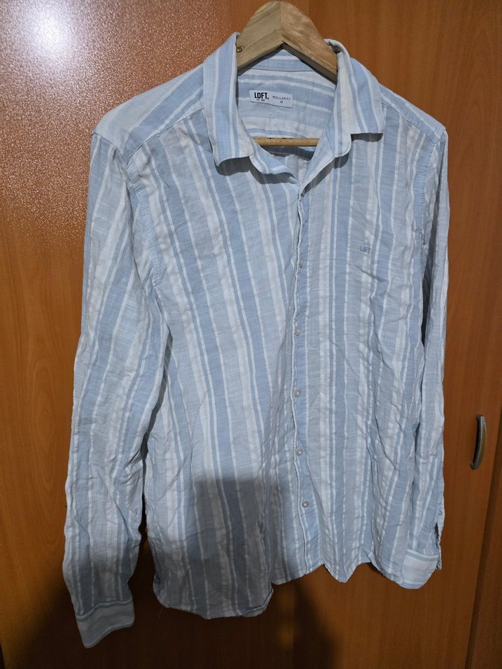 loft m beden keten gömlek. Nefes alabilen keten kumaştan yapılmış, düğmeli ve uzun kollu erkek gömleği. Mavi tonlarında ince çizgiler içerir, rahat kesim ve yakalıdır.