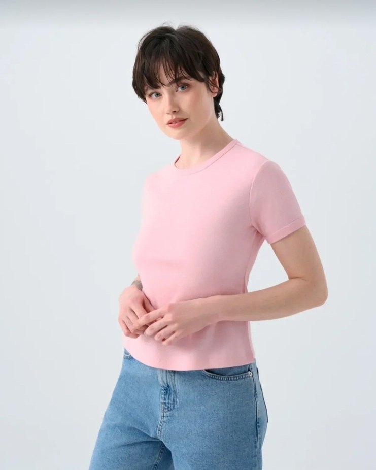 Bir iki kez giyildi, rengi yakışmadığı için satıyorum. Temiz gönderilecektir. Orijinaldir. Düz pastel pembe renkte, kısa kollu, yuvarlak yakalı, vücuda oturan kısa kesim kadın tişörtü. Yumuşak kumaştan üretilmiştir, günlük kullanıma uygundur.