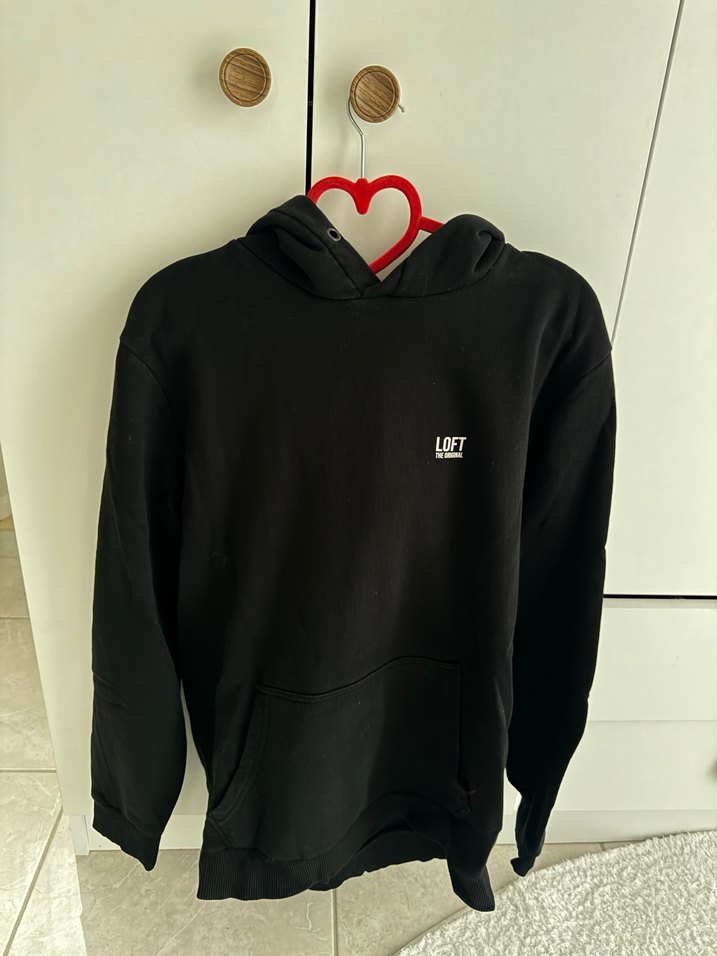 LOFT marka siyah kapüşonlu sweatshirt, uzun kollu ve yuvarlak yakalıdır. Rahat kesimi ve yumuşak kumaşıyla günlük kullanıma uygundur. Önünde küçük logo ve kanguru cepli, salaş tarzda.