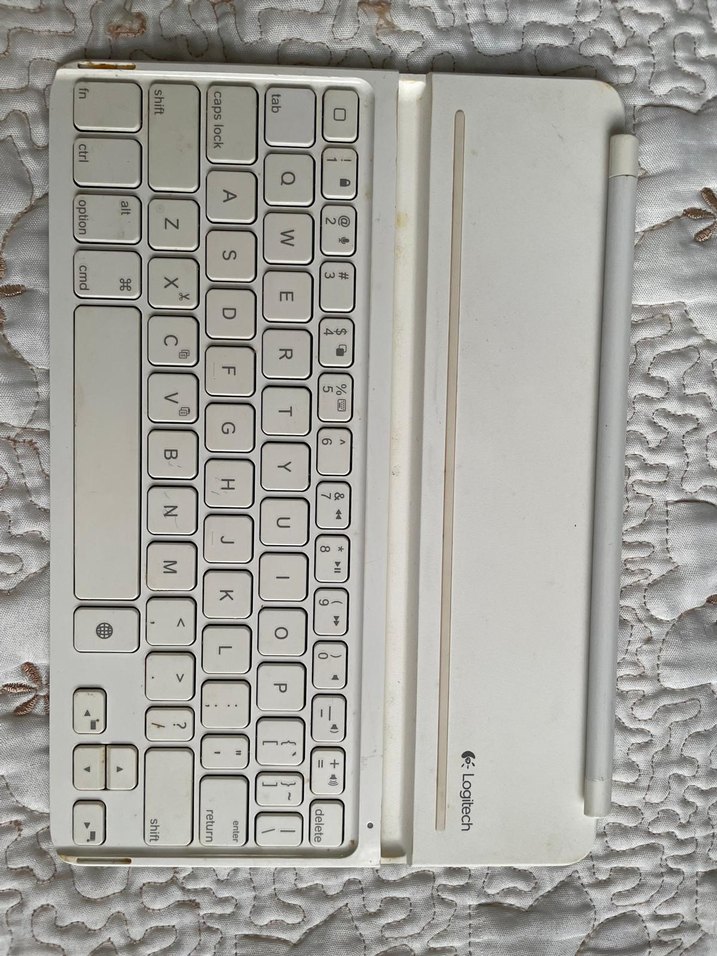 Logitech marka Ultrathin Keyboard Cover i5 (Model: Y-R0041 / P/N: 820-006044). iPad için kılıf + klavye kombinasyonu. Fotoğraflardaki ürün gönderilecektir — temizliği yapılmış, çalışır durumda (Bluetooth / dahili batarya/power bilgisi: Rating 5V — 200mA). Tuşlarda ve kapakta kullanım izleri vardır (fotoğraflarda görünür). iPad Air serileriyle uyumludur