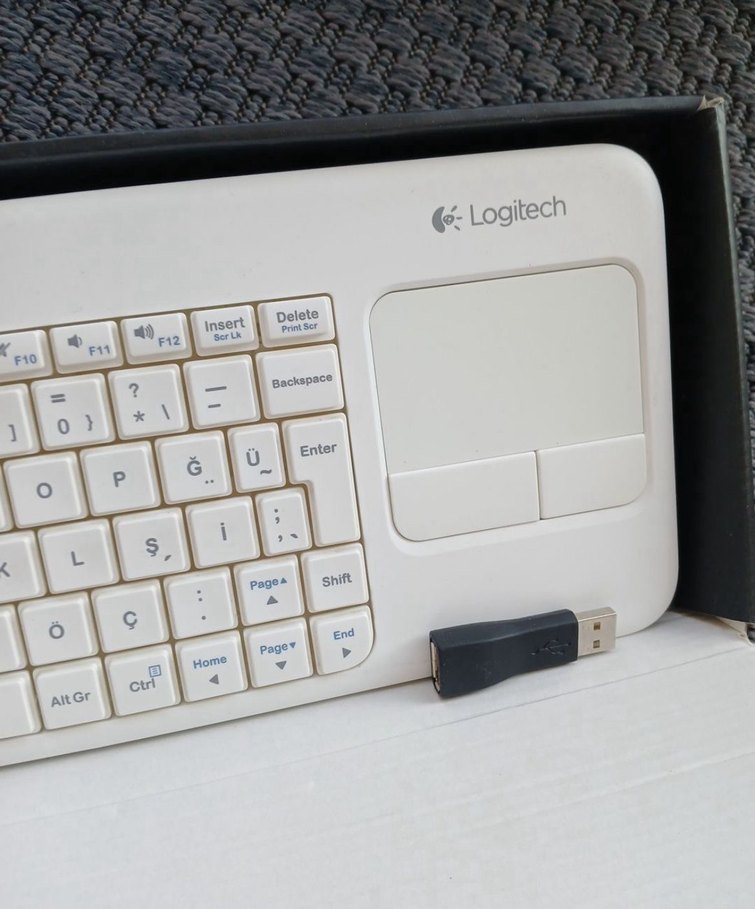 Beyaz renkli Logitech kablosuz klavye, entegre dokunmatik yüzey ve USB alıcısı ile kompakt bir tasarıma sahiptir. Hafif renk tonları ve medya tuşları bulunur. ⌨️