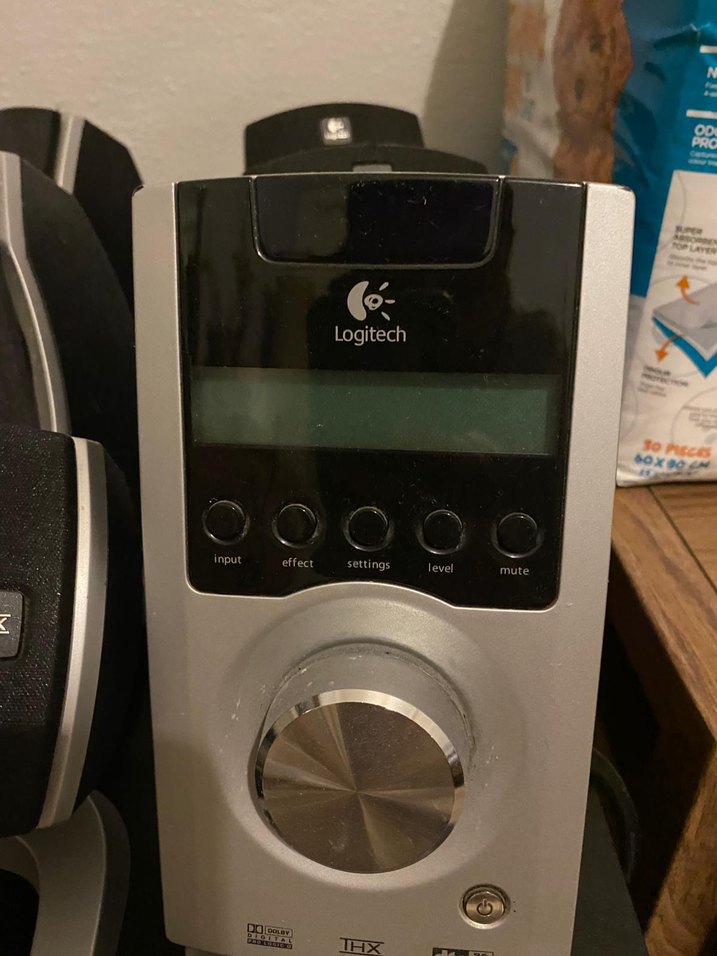 Logitech markalı gri beyaz ev sinema sistemi, giriş, efekt, ayarlar, seviye ve sessiz düğmelerine sahip, büyük ses kontrol düğmesi bulunur. 5+1 sinema sistemi dolbi z5500