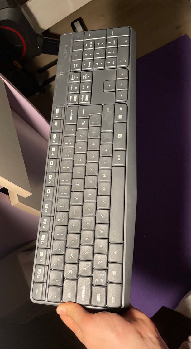 Logitech markalı koyu gri renkli, tam düzenli, fonksiyon tuşlu ve sayısal tuş takımı bulunan kablolu klavye. Rahat yazım sunar. ⌨️