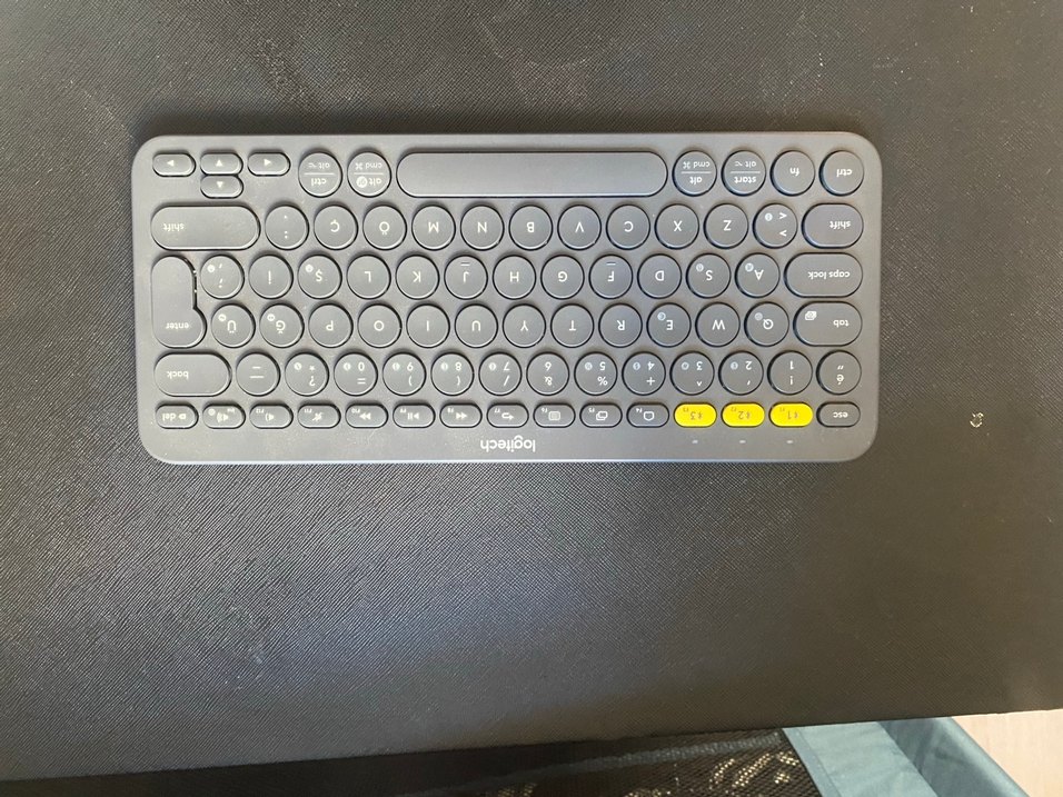 Logitech marka, yuvarlak tuşlara ve gri gövdeye sahip klavye. Kısayol tuşları ve mobil cihazlar için yuvası bulunur.
