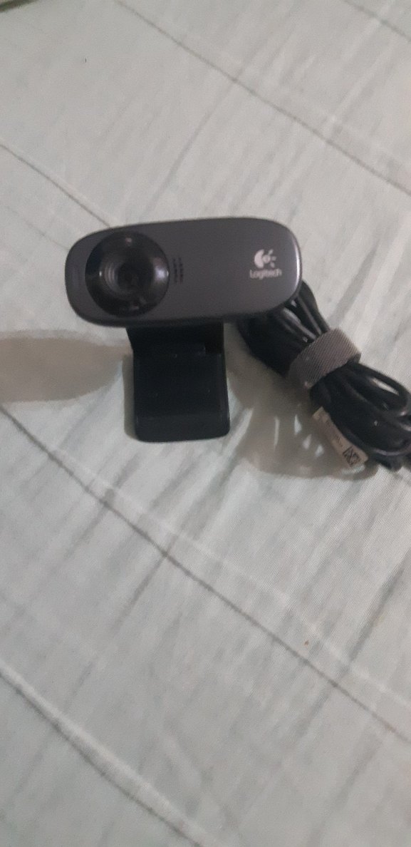 Logitech siyah ve gri renkli video kamera, yerleşik lens ve USB bağlantı kablosu ile birlikte gelir.