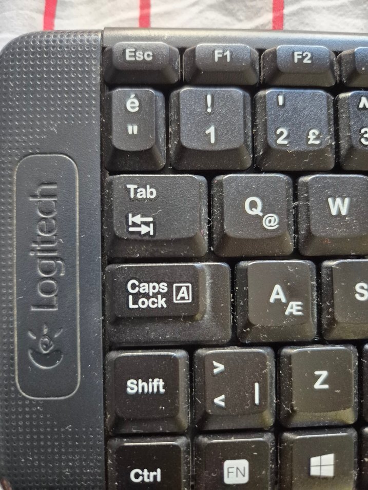 Logitech marka siyah klavye, Esc, F1, F2, Tab, Caps Lock, Shift, Ctrl ve fonksiyon tuşlarıyla beyaz harfler içerir. ️