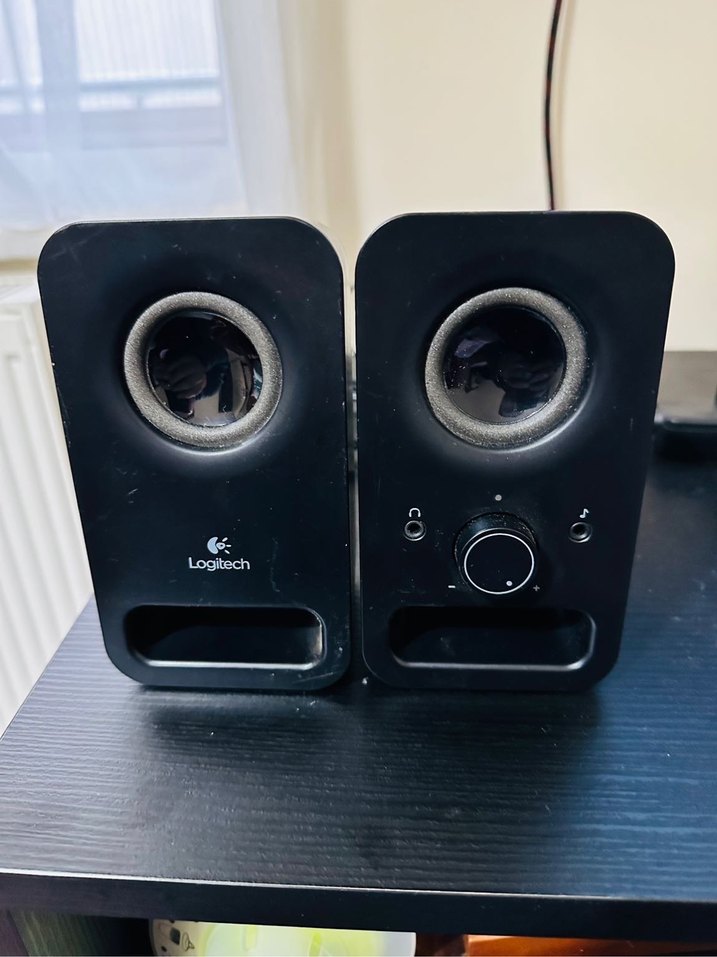Ses kontrol düğmeli ve kulaklık girişi bulunan siyah Logitech masaüstü hoparlörler.