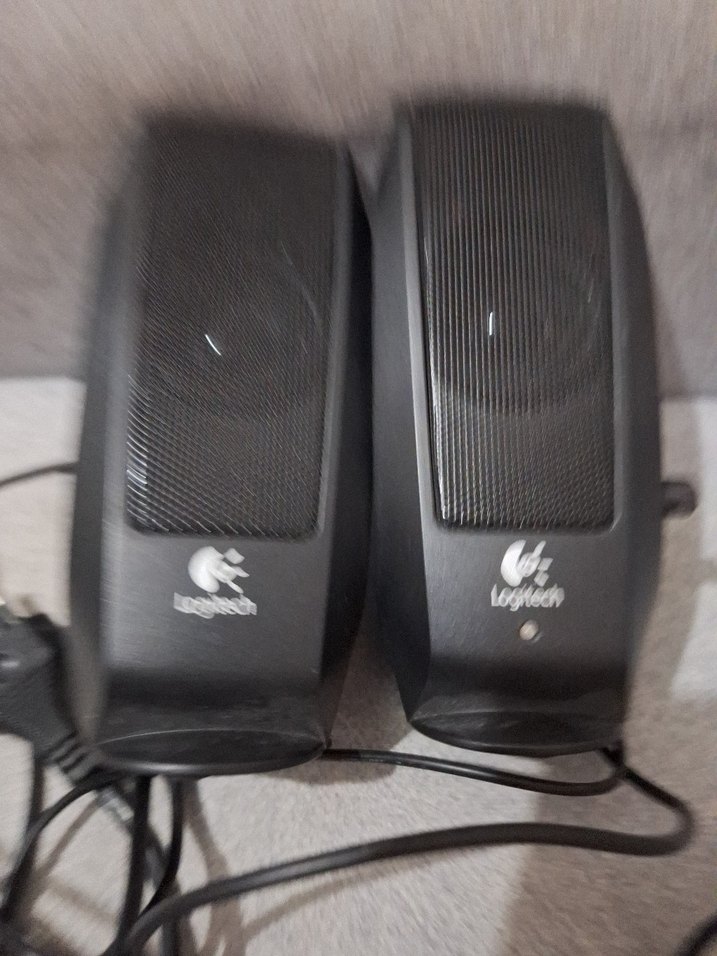 İki hoparlörlü siyah Logitech müzik sistemi, net ses çıkışı sağlar. Kompakt ve kablolu bağlantı ile kullanılır.