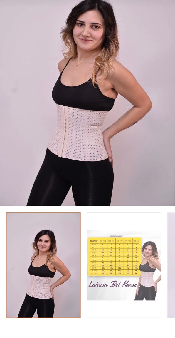 Bej renkli, kısa ve vücuda oturan lohusa bel korsesi. Düz ve hafif tonlu, ön kancalı kapanışlı, doğum sonrası destek için uygundur.