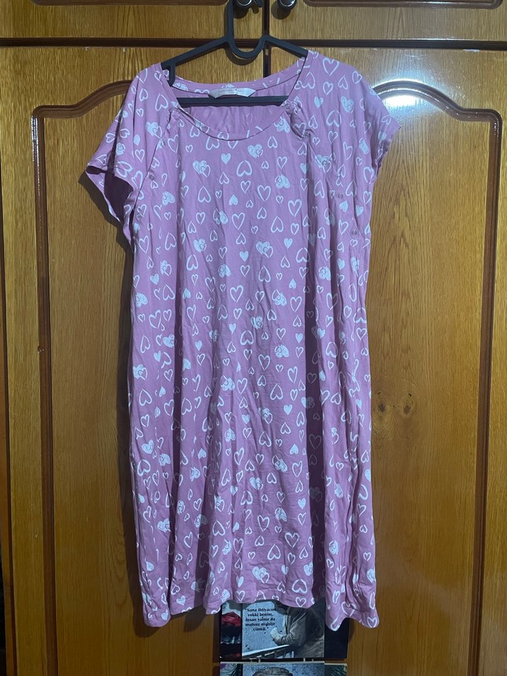 Rahat kesim, kısa kollu midi pijama elbisesi, pastel pembe bağlama desenli ve kalp baskılı, konforlu sokak stili için uygundur. Ürün çok az giyildi göründüğü gibidir