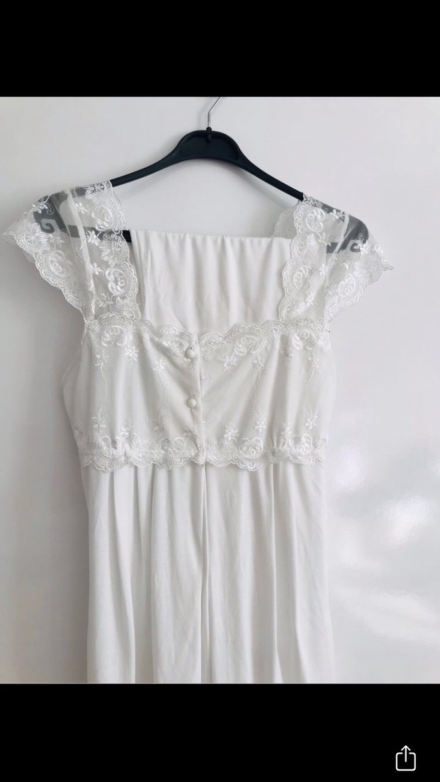 Hiç kullanılmadı sadece yıkandı ütülendi.Bu beyaz lohusa,hamile ve emzirme gecelik, straplez yaka ve dantel detaylı kol yapısına sahiptir. Uzun boylu ve vücuda oturan kesimlidir.