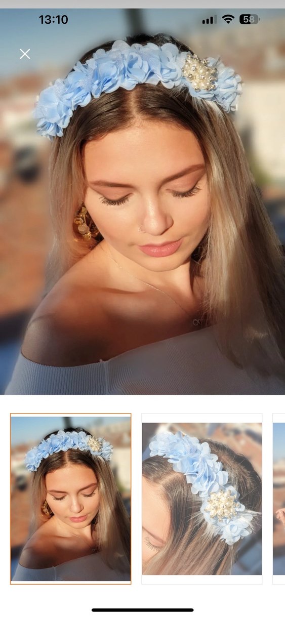Pastel mavi renkte, boncuk detaylı ve sentetik kumaştan yapılmış çiçekli saç bandı, bohem tarz için uygundur. Fotoğraf çekimi sırasında kullanıldı sadece