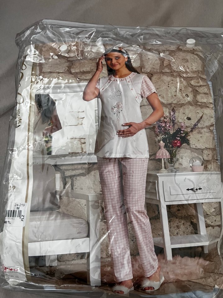 Beyaz bağlama desenli, kısa kollu, normal boy midi kadın lohusa pijama takımıdır. Rahat ve gevşek kesimdir.