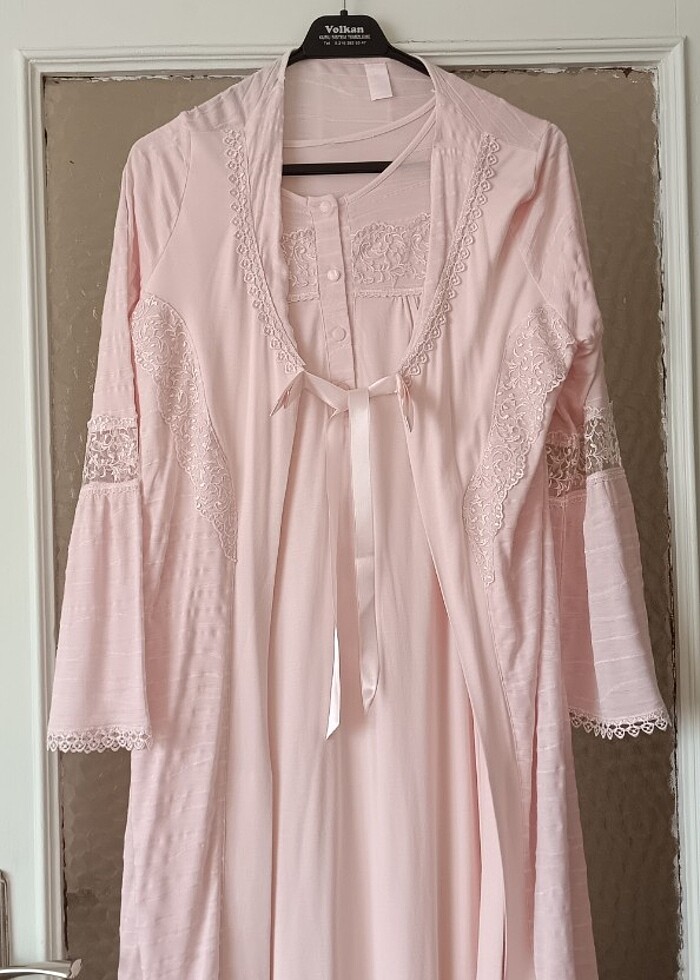 Ürünü hastane çekimi için almıştım ama giyemedim, yıkandı o yüzden etiketi mevcut degil ama hic giyilmedi ici kisa kol gecelik üstü dantel detaylı sabahlık çok şık ve malı yumuşacık