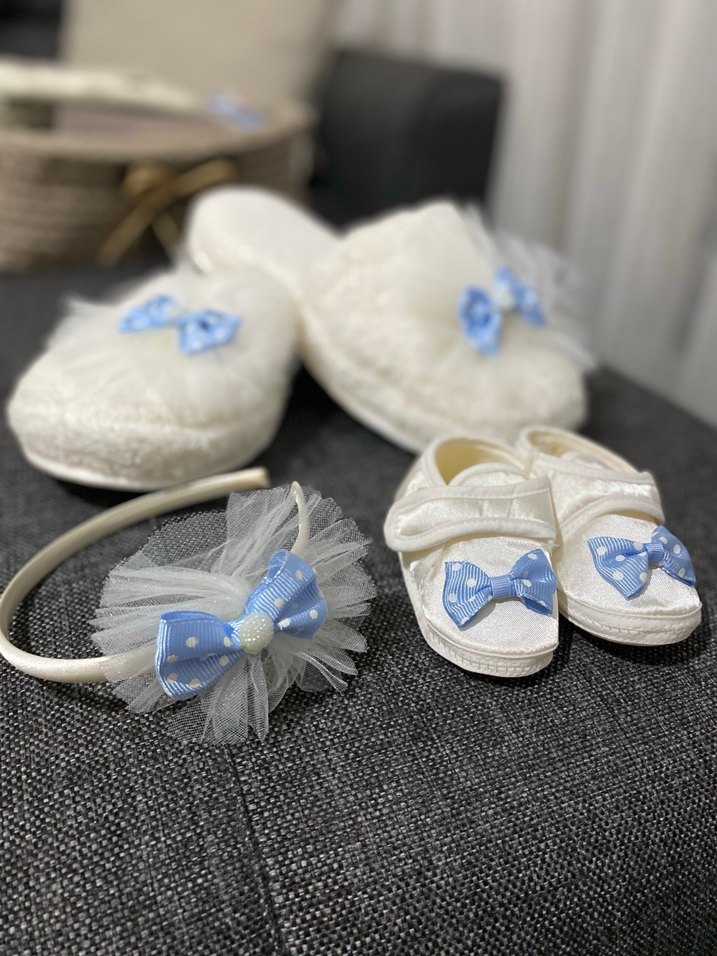 Hiç kullanılmadı hediye alınmıştı. Bir çift terlik , bir çift bebek ayakkabısı , bir adet taç vardır.