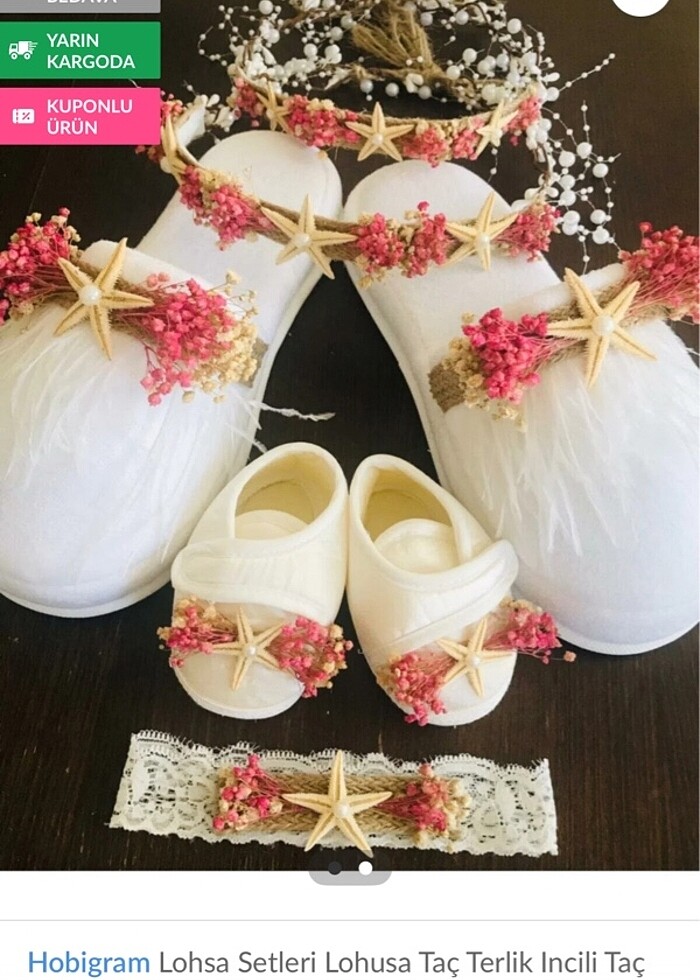 Lohusa tacı, terliği ve bebek bandı, patiği 4 lü takım. Deniz yıldızı ve kuru çiçekli. Herhangi bir hasarı yok