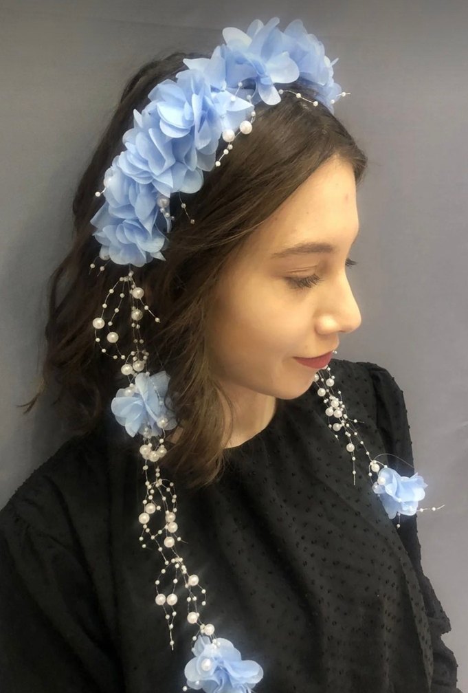 Sıfır ürün hiç kullanılmadı etiketli ürün değil. Lohusa Tacı Bebe Mavi Lazer Çiçekli İncili Saç Aksesuarı