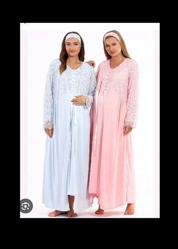 Pudra renk lohusa takımı içinin elbisesi ve dışının sabahlığı mevcut kalıbı geniştir dantellidir