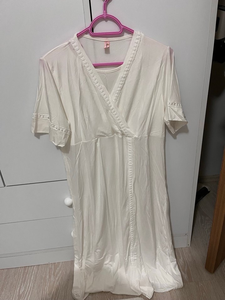 Kısa kollu, V yaka ve midi boy bol kesim beyaz lohusa sabahlık. Kenarlarında ince işlemeler bulunur, rahat ve kullanışlıdır. Hiç kullanılmamıştır.