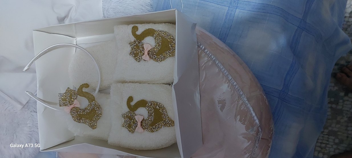 Krem renk Kedi desenli lohusa terlik taç seti sıfır kutusunda ihtiyaç fazlası izmir içi elden teslim sağlanır.