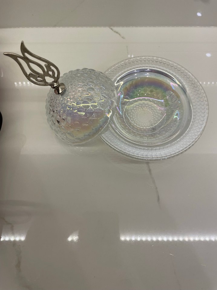 Parlak beyaz yılan desenli tabak, üzerinde kabarcıklı dokulu ve şık kulplu kapak ile tamamlanmıştır. ️