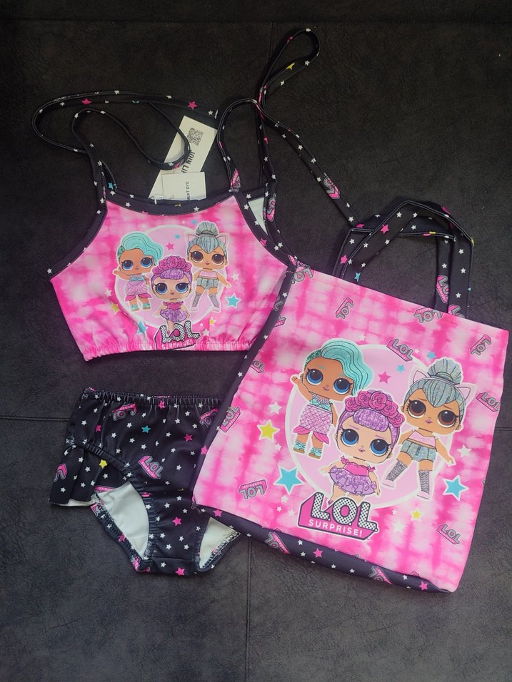 Kız çocukları için LOL baskılı, askılı pembe bikini ve uyumlu çanta seti.etiketi üzerinde.