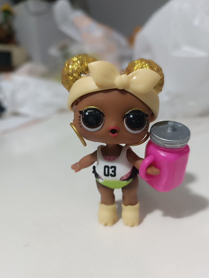Bu bebek, açık pembe aksesuarlar ve parlak pembe kavanoz ile birlikte gelir. Üzerinde '03' yazan beyaz bir üst ve altın simli saç topuzları vardır. orjinal yurtdışı ürünüdür çoklu alımlarda lütfen ürün birleştirme isteyin