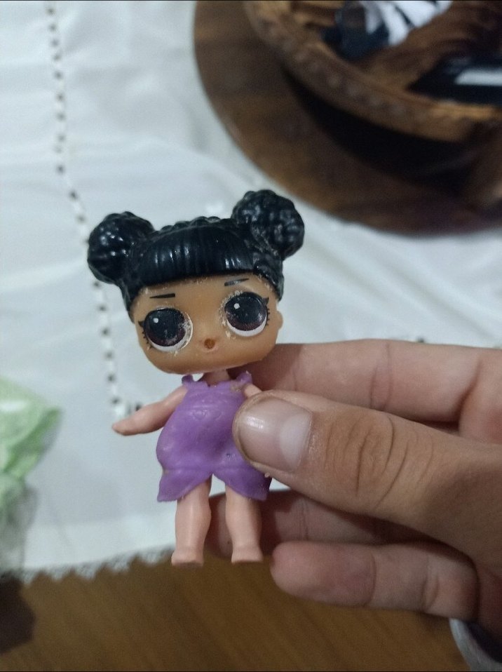Siyah iki topuzlu saçları ve büyük gözleri olan, pastel mor elbiseli küçük bebek.