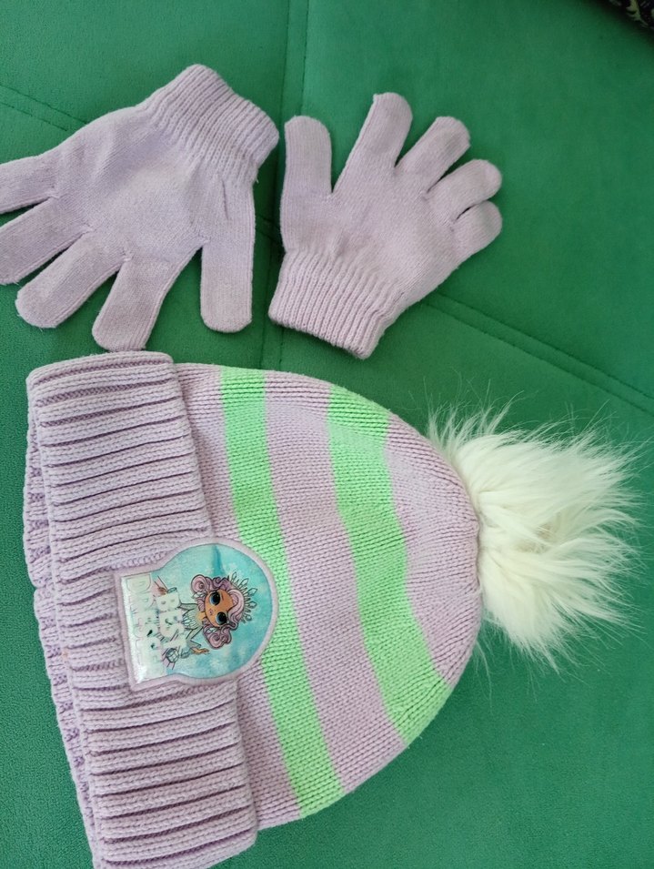Mor ve yeşil çizgili, nakışlı ve ponponlu çocuk bere ile uyumlu eldiven seti. Yumuşak ve sıcak dokusu günlük kullanıma uygundur. 2.5-3 yaş uyumlu lol bebekli LCW marka